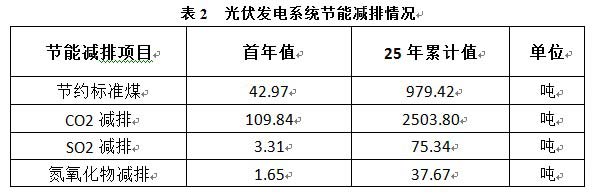 光伏發(fā)電節(jié)能分析:根據(jù)北京市太陽能資源條件,項(xiàng)目組件全年可接受的太陽輻射量約為1394kWh/m2,系統(tǒng)整體效率按照78%來做發(fā)電量評估,則項(xiàng)目建成后光伏電站首年發(fā)電量約130.21 MWh,25年累計(jì)發(fā)電量為2967.94MWh。光伏電站的節(jié)能效益可以用節(jié)省標(biāo)準(zhǔn)煤的數(shù)量來衡量。>常用燃煤火電機(jī)組發(fā)電,每發(fā)電1kWh需消耗標(biāo)準(zhǔn)煤約330g。光伏電站的環(huán)保效益則以溫室氣體的減排數(shù)量來衡量。具體數(shù)據(jù)見表2。