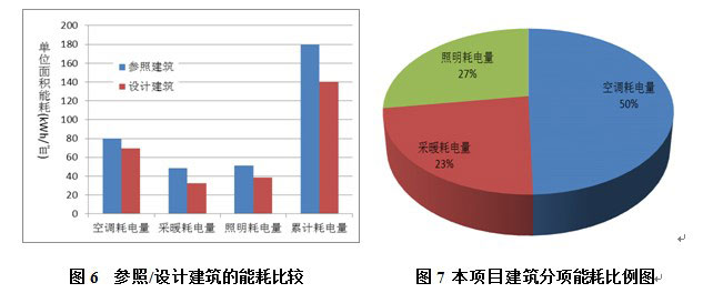 能耗分析:項(xiàng)目采用Dest建筑能耗分析軟件對本項(xiàng)目進(jìn)行全年能耗動態(tài)模擬計(jì)算,得出建筑節(jié)能率為61%,各項(xiàng)能耗數(shù)據(jù)見表1,建筑能耗比列關(guān)系見圖6~圖7。