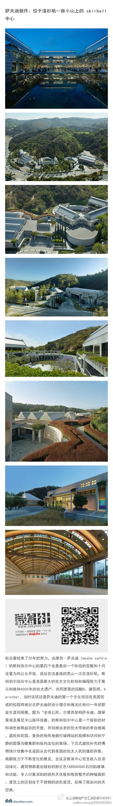 @上海房地產總工俱樂部SHREEC: 薩夫迪新作:位于洛杉磯一座小山上的 skirball 中心:下沉式庭院補У牟┪錒菁蘋集中在追蹤從古代到美國的猶太人民的值的異象。畫廊致力于不斷變化的展覽,會議及教育中心完全嵌入在滾動綠化。令人印象深刻的拱形天花板和修剪整齊的種植面積。不銹鋼的拱形屋頂,反映了南加州的天空畫。