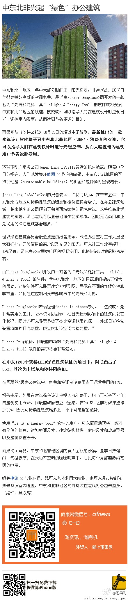 @雨果網:中東北非興起“綠色”辦公建筑 中東和北非地區境內有大面積的沙漠,夏季日照強烈,氣溫極高。在大功率空調的嗡嗡響聲中,居民每個月都要繳納高額的電費。綠色建筑節能環保,既可以充分利用太陽能,也可以通過控制光照來降低室內溫度。