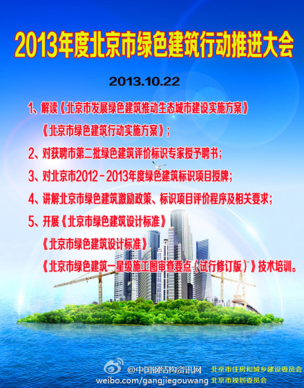 @中國鋼結構資訊網:北京綠色建筑行動大會將開 由北京住建委和北京規劃委聯合舉辦的2013年度北京<綠色建筑行動推進大會將于10月22日在北京建設大廈舉行,費用免費。會議內容見下圖