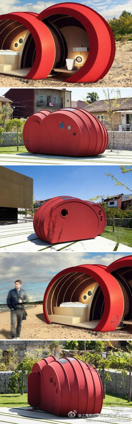 @上海房地產總工俱樂部SHREEC: 綠色建筑 shelter byGG概念住宅:這座小型建筑建在葡萄牙。這個實驗性的居住概念方案將雕塑與建筑相結合,創造出了一個類似于蠶繭的居住小空間。這個可移動的居住模塊配有一個雙人間和一個浴室。建筑師將可持續性作為設計的重點,在建造過程中使 生態材料,并用太陽能光電板作為能源收集方式。