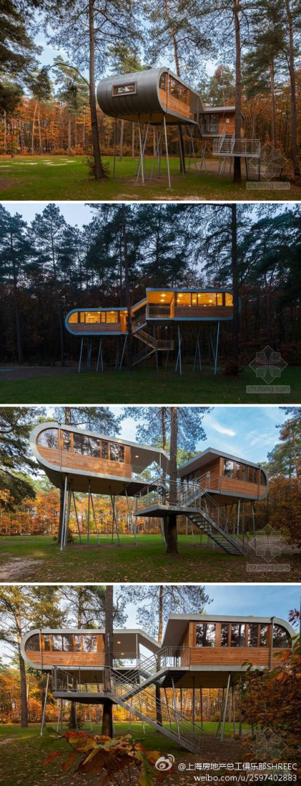 @上海房地產總工俱樂部SHREEC: 綠色建筑 這座樹屋由baumraum設計事務所設計,位于弗蘭德的森林里,業主是一位造紙商,也是當地公社的組織者。這座建筑是用來從那些會議和生意中逃離,尋找一個能夠在真正的自然中思考環保的地方,以使地球的未來更為美好。支撐云杉木板外墻和建筑盡端圓形的結構框架是氧化鋅帶,外觀呈橢圓鰲