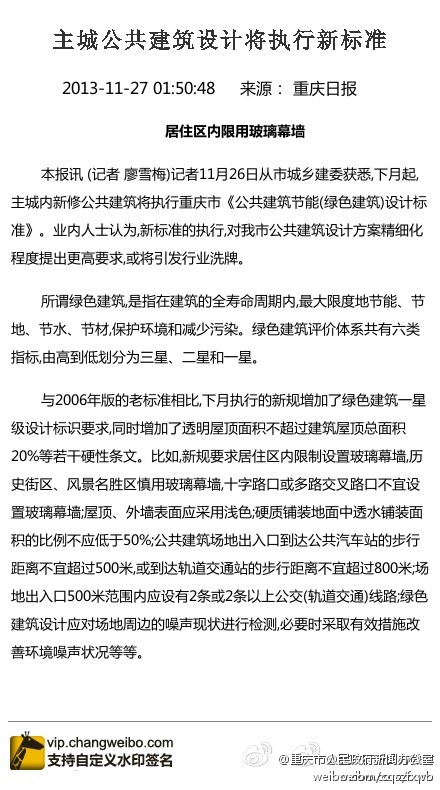 @重慶市人民政府新聞辦公室: 主城公共建筑設(shè)計將執(zhí)行新標(biāo)準(zhǔn) 居住區(qū)內(nèi)限用玻璃幕墻 記者11月26日從市城鄉(xiāng)建委獲悉,下月起,主城內(nèi)新修公共建筑將執(zhí)行重慶市《公共建筑節(jié)能(綠色建筑)設(shè)計標(biāo)準(zhǔn)》。業(yè)內(nèi)人士認(rèn)為,新標(biāo)準(zhǔn)的執(zhí)行,對我市公共建筑設(shè)計方案精細(xì)化程度提出更高要求,或?qū)⒁l(fā)行業(yè)洗牌。