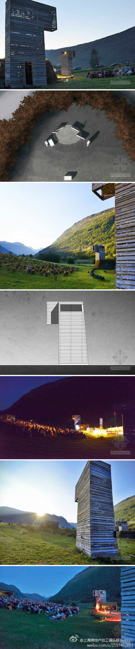 @上海房地產總工俱樂部SHREEC:綠色建筑 Bjornadal設計挪威海姆內斯戶外劇場:這個美麗的建筑位于挪威海姆內斯壯麗的群山中。舞臺的兩側設有木制塔樓,傳承了挪威景觀營造的傳統和民俗,使用了天然的當地材料。該項目利用了場地天然山坡的優勢,這些座位直接采用了天然的伐倒木,而取自當地鋸木廠的簡易樹樁更是代替了單人小凳。