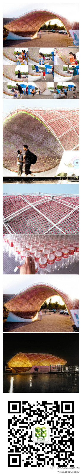@生態城市與綠色建筑: 綠色建筑 可口可樂回收塑料瓶公共藝術裝置:由penda設計的“cola-bow”是一個公共藝術裝置,由17.000多個回收的塑料可樂瓶組成,它們被綁在一起,形成了曲線形的可口可樂logo圖案。這件作品希望能喚起公眾對塑料污染的重視,鼓勵市民將回收塑料瓶作為經常性地環保行為來推廣。