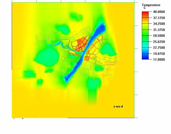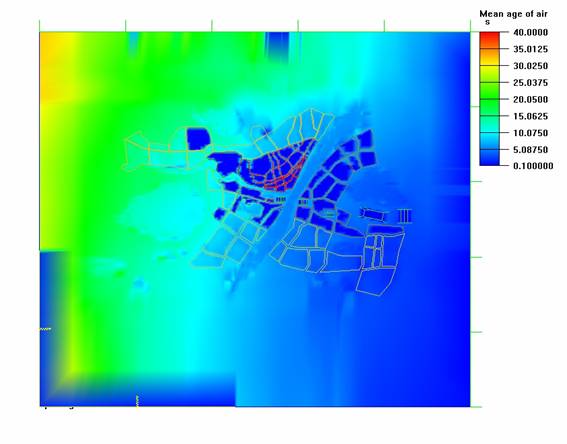 圖3 溫 度 圖Fig.3 temperature picture通過在CFD中的模擬計(jì)算,得出城市在受到一定氣候影響中的溫度、風(fēng)速、大氣壓和太陽輻射情況,通過綜合分析這些模擬計(jì)算結(jié)果,最終得出有科學(xué)依據(jù)的城市規(guī)劃布局與城市氣候之間的關(guān)系。以武漢市夏季白天為例,模擬城市在西南主導(dǎo)風(fēng)向作用下的溫度情況。通過模擬計(jì)算出的溫度圖(圖3),可以明顯看出,在夏季白天主導(dǎo)風(fēng)向情況下,武漢市熱區(qū)域分布構(gòu)成以市區(qū)為主,面積大、分布集中的多中心城市熱區(qū)域的主要特征。市區(qū)被長江、漢江分割形成三鎮(zhèn)(漢口、漢陽、武昌)四片(漢口、漢陽、武昌、青山)的多中心結(jié)構(gòu)。針對(duì)漢口主城區(qū)而言,大面積城區(qū)溫度高,武昌和漢陽城區(qū)部分地區(qū)溫度高,其它地區(qū)溫度相對(duì)較低,明顯形成了城市的“熱島效應(yīng)”。從速度圖和空氣齡圖(圖