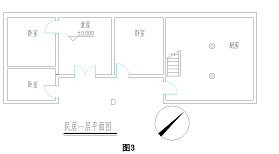 圖5 正房平面示泛民居的院落結(jié)構(gòu)很類似四合院,正房一層平面如圖5。正房一層由兩個(gè)臥室和東側(cè)廚房等空間,一層前面出檐1800mm左右,這主要考慮在夏天寬敞的屋檐下是外部納涼的美好空間,而二樓空間南向墻面為通體窗,這樣空間采光通風(fēng)都比較好。由于夏季多雨,民居二樓也作為涼曬糧食的最佳場(chǎng)所。這一點(diǎn)更體現(xiàn)了南方溫和的氣候在建筑上的反映。此外從建筑空間的構(gòu)成上來看,傳統(tǒng)民居采用了進(jìn)深不是很大,中間和鞲霰嚦間(如圖5),兩個(gè)邊開間均為3533mm(1.06丈),中開間則為3933mm(1.18丈),與當(dāng)?shù)貍鹘y(tǒng)木構(gòu)架之定數(shù)相一致[4];前檐進(jìn)深1800mm,房屋進(jìn)深4200mm,總進(jìn)深6000mm。這中空間構(gòu)成符合木結(jié)構(gòu)建筑模數(shù)等的有關(guān)規(guī)定。