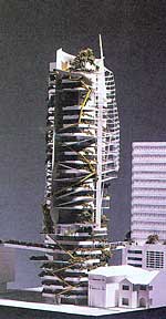 圖7 楊經(jīng)文等設(shè)計(jì)展覽塔樓[6]3、楊經(jīng)文的創(chuàng)作理念。楊經(jīng)文曾在倫敦學(xué)習(xí)建筑,致力于生態(tài)建筑研究。后來在馬來西亞組建了自己的工作室,他以“綠色摩天樓”在世界范圍內(nèi)享有盛譽(yù)。在楊經(jīng)文的創(chuàng)作理念里,建筑首先要考慮的是氣候因素,所構(gòu)造的建筑空間形態(tài)也因?yàn)橐m應(yīng)當(dāng)?shù)氐臍夂驐l件而別具韻味,馬來西亞的“綠色摩天樓”將植物罱ㄖ結(jié)合,植物部分的布設(shè)隨著太陽一天內(nèi)方位角的變化而有所不同,這些植物有效地將陽光遮擋在建筑的外面。同是在楊的創(chuàng)作中,建筑內(nèi)部也設(shè)有大量的過渡空間,這些空間抑或是寬大的中空花園,抑或是巨大屋頂花園等等,這些空間在熱帶氣候條件下對(duì)建筑的能耗節(jié)約起到了積極的鈑謾五、結(jié)語建筑空間設(shè)計(jì)是個(gè)重要的復(fù)雜的問題,不少先輩們對(duì)空間設(shè)計(jì)提出了許多理念和設(shè)計(jì)手法,本文提出的“氣候性”旨在現(xiàn)代建筑的發(fā)展應(yīng)該更多的關(guān)注氣候因素對(duì)空間設(shè)計(jì)的影響,并借助現(xiàn)代的高技術(shù)把罹踴肪誠蚪諛堋⒒繁<翱沙中的方向發(fā)展。參考文獻(xiàn):[1].中國建筑學(xué)會(huì)建筑物理分會(huì),陳啟高建筑物理學(xué)術(shù)論文選集[M],中國建筑工業(yè)出版社,2004年9月第一版,267-269[2]. http://www.china.com.cn/chinese/zhuanti/184680.htm[3]. 劉艷峰,陽光間式靠山窯洞室內(nèi)熱環(huán)境動(dòng)態(tài)模擬,西安建筑科技大學(xué)碩士學(xué)位論文[4].趙西平,劉加平,尚建麗,趙方周,云南彝族傳統(tǒng)民居構(gòu)造技術(shù),西安建筑科技大學(xué)學(xué)報(bào)(自然科學(xué)版)[J],2005年3月,40-44[5].黃丹麾,生態(tài)建筑[M],山東美術(shù)出版社,2006年1月第一版,104,107,110-113,[6]. http://wamp.far2000.com/worldarch/2001/4/select.asp