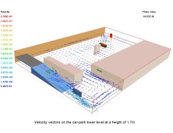 The PHOENICS analysis allowed optimisation and verification of Rucon's ventilation strategy. Rucon commented "We have used CFD to prove that in the case of a car fire on the lower level, smoke does not progress to the upper level by use of the right ventilation system and strategy. The reason and the big advantage we have by using PHOENICS, is the fact that we can predict the movement of air and smoke in a car park before something is installed. We can make the airflow visible and understandable."