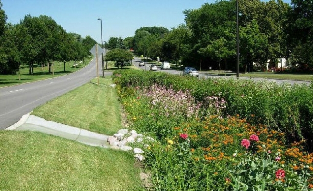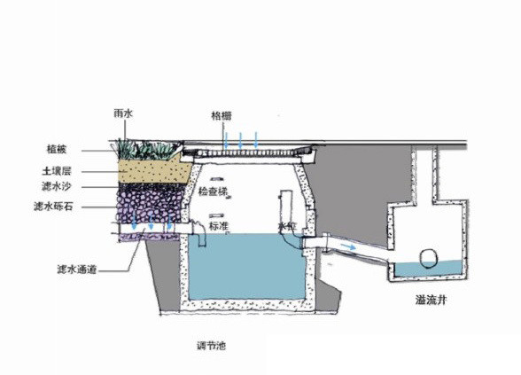 下凹式綠地集水通過草溝等形式收集場地中的徑流雨水,當雨水流過地表淺溝,污染物在過濾、滲透吸收及生物降解的聯合作用下被去除,植被同時也降低了雨水流速,使顆粒物得到沉淀,達到控制雨水徑流的目的。